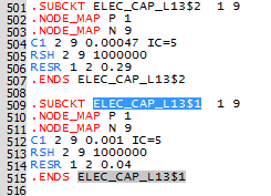 Next, look at the subcircuit definitions for the two subcircuits called by the deck instantiations for C1 and C2.