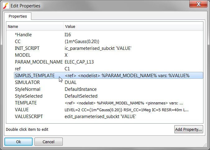 During the netlist process, the SIMPLIS_TEMPLATE property is resolved by the netlister. The netlister evaluates the template keywords enclosed in the greater-than and less-than brackets and substitutes literal properties enclosed in the percent signs, such as %PARAM_MODEL_NAME% and %VALUE%. Text which is not enclosed in the special characters, % and <>, is interpreted as literal text, and is passed on to the netlist without modification. There are several other template keywords, for a complete list, see: Template Property. Next, open the netlist file and find the netlist entry for C1.